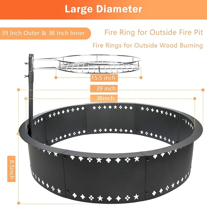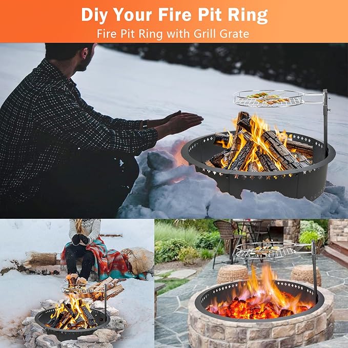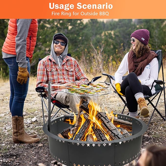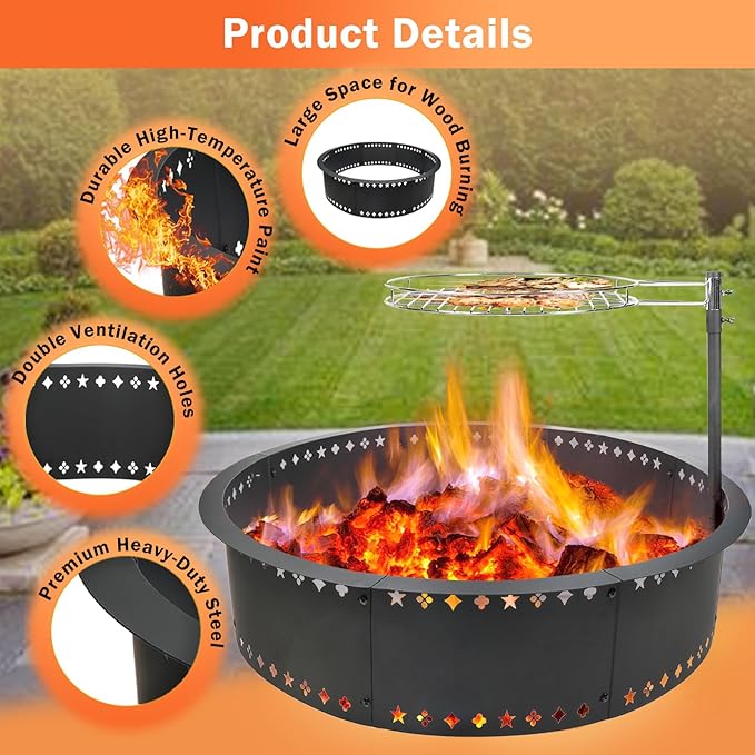 - 【Premium&Durable】The 36“ fire ring for outside fire pit ring with grill is crafted from sturdy heavy-duty steel and coated with a thick,high-temperature resistant paint.Engineered to withstand extreme temperatures(600°C/1110°F),Our outdoor firepit ring ensures long-lasting durability for years of outdoor enjoyment.