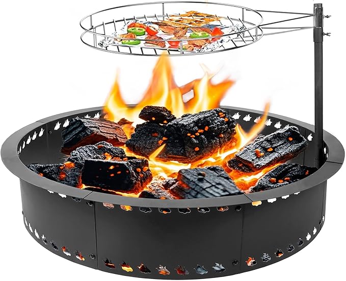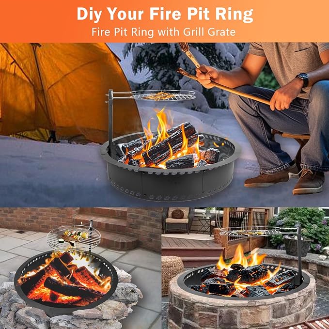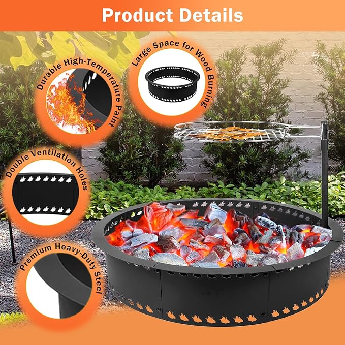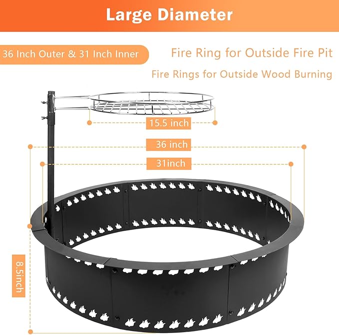 - 【Premium&Durable】The 31“ fire ring for outside fire pit ring with grill is crafted from sturdy heavy-duty steel and coated with a thick,high-temperature resistant paint.Engineered to withstand extreme temperatures(600°C/1110°F),Our outdoor firepit ring ensures long-lasting durability for years of outdoor enjoyment.