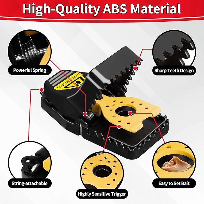 - HIGHLY SENSITIVE & QUICK CAPTURE: Designed with powerful springs and a large mouth design, each trap is incredibly sensitive—0.03 lbs of weight can trigger it. This ensures instant capture and humane killing of small mice, minimizing suffering. This ensures a humane method of killing small pests while preventing any chance of escape.