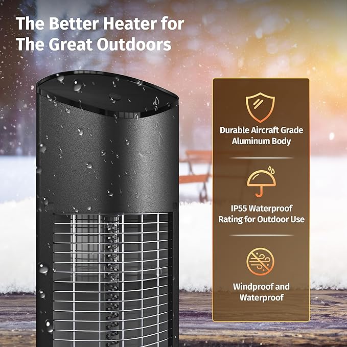 - OUTDOOR SAFETY: The outdoor patio heater's aluminum body is windproof, dustproof, and equipped with an IP55 waterproof rating for maximum weather resistance. It is engineered with an automatic shut-off in case it is accidentally knocked over