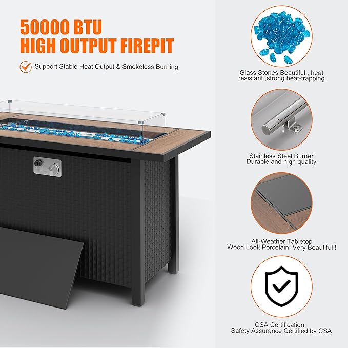 - Perfect Heater: With no hassle of smoke, ash, mess, heave wood bundles being carried, just need to turn on the knob, this fire pit table would give off a very nice from low to high flame. And it can reach to 50000BTU with CSA certification, keeping you in a warm and safe atmosphere