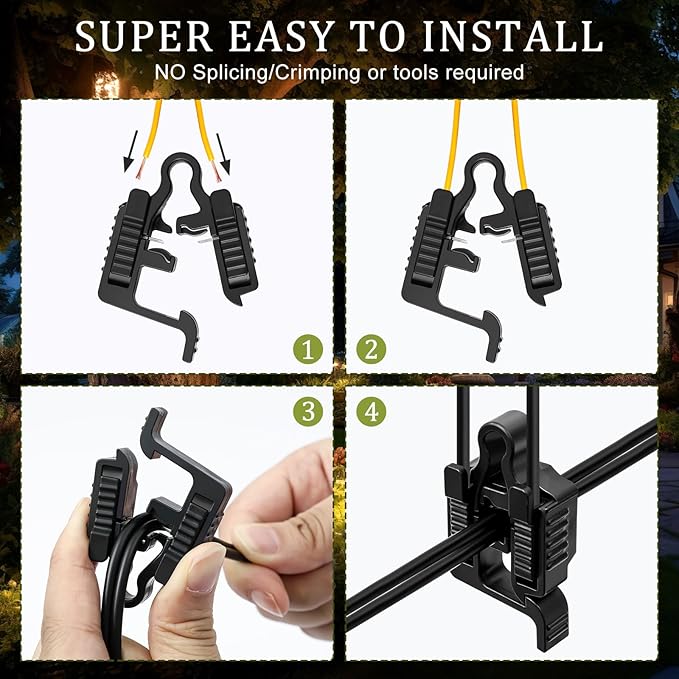 - [EASY TO INSTALL]No splicing/crimping or tools required; First, insert and lock the conductor of the landscape light; Second, place the landscape lighting cable connector at right angles and compress it on either side of the low voltage feed line; Finally, lock the connector; Quickly and easily install low voltage wires to your lighting fixtures in 2 minutes or less and enjoy the lighting right away