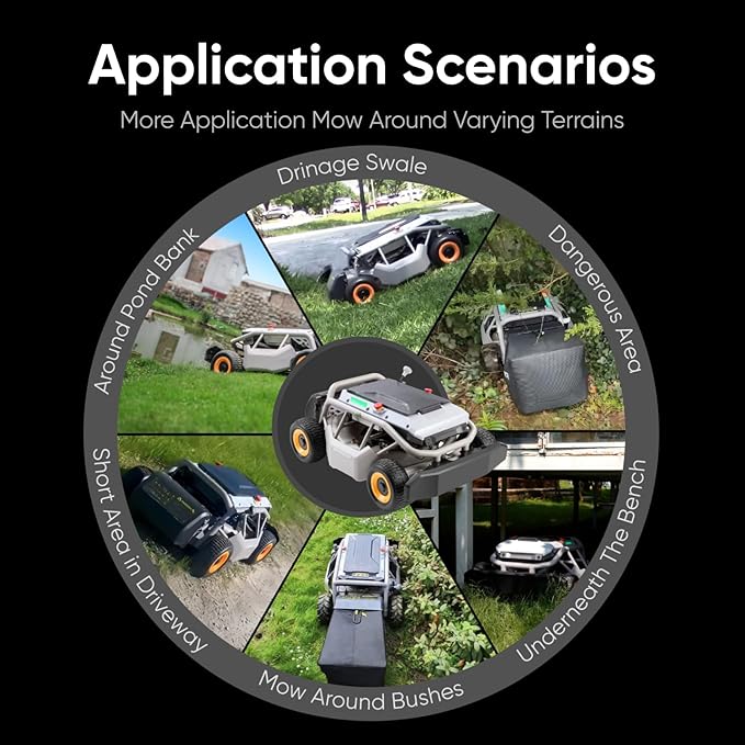 - πΉ Dominates 75% Slopes Safely & Effortlessly β Powered by Beast Quad 1000W Motors + FOC E-Brake for unstoppable traction. No more back-breaking pushing β remote control enables 300% faster slope mowing vs. traditional mowers with zero tip-over risk.
