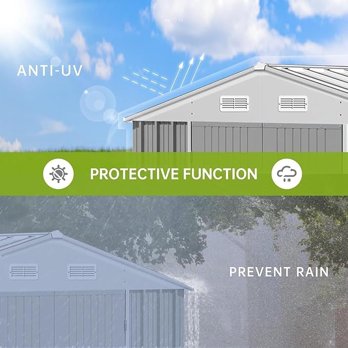 - 【Durable & Strong Storage Shed】: Outdoor storage shed is made of high quality galvanized steel and frame, which is waterproof, durable, rustproof and UV resistant. The overlapping wall panels are waterproof and moisture resistant for worry-free use in all weather conditions and can be used all year round.