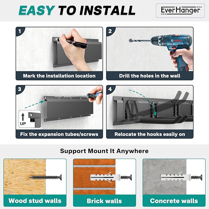 - Customizable Organization: Featuring 12 adjustable hooks that slide easily along the rail, allowing you to organize tools of all sizes. Rearrange the hooks as needed for flexible, on-the-fly storage solutions