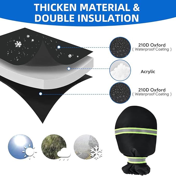 - ·Proven Cold and Waterproof Waterial:The faucet covers for winterare made of three-layer design with high-quality anti-freeze and waterproof material. The surface is 210D Oxford protective waterproof coating to prevent rainweather. The middle layer is filled with Acryfiber anti-freeze insulation material. The inner layer uses Oxford cloth again to achieve multiple protection. It can effectively protect your outdoor water spigotfrom exposure to sun, rain, snow and cold air
