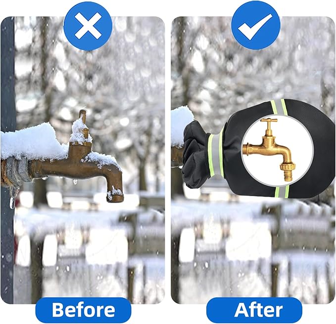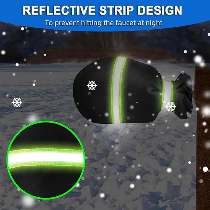 - ·Easy to use:Our hose pipe insulation cover for winter has strong Velcro with reflective strips on both sides of the cuff,please simply slip the outdoor faucet cover over your faucet, wrap the pocket tightly with the Velcro straps,ensure the sleeve fits snugly around the neck of the faucet, to give your spigot covers winter insulated. In opposite simply pull off the velcro straps that are stuck together to remove for next use