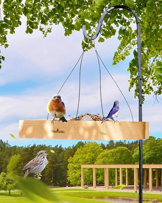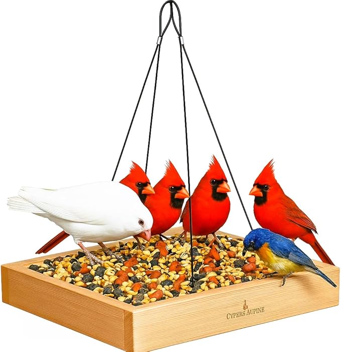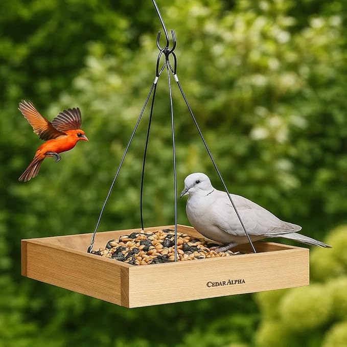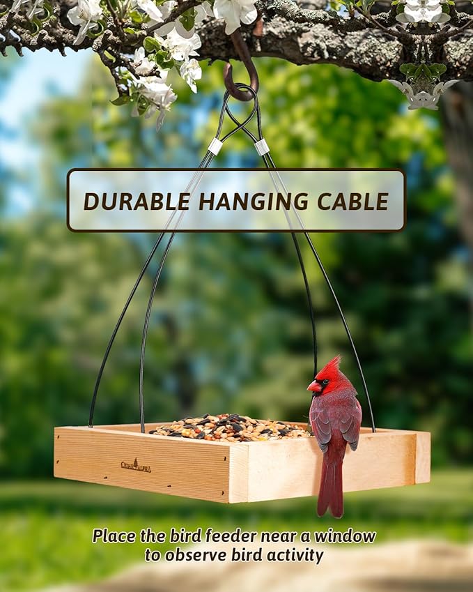 Wood Platform Tray Bird Feeder 10” - Alaskan Red Cedar Hanging Bird Feeder for Outside Outdoor - Stainless Steel Cable Mesh Base - Longtime Outdoor Lasting Weatherable Heavy Duty Flythrough Birdfeeder