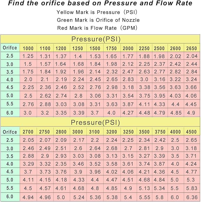 - ATTENTION: Please see Image and find the orifice you need based on working pressure and flow rate (GPM).The orifice of these pressure washer nozzles are 5.5GPM. The working pressure is up to 4000 PSI