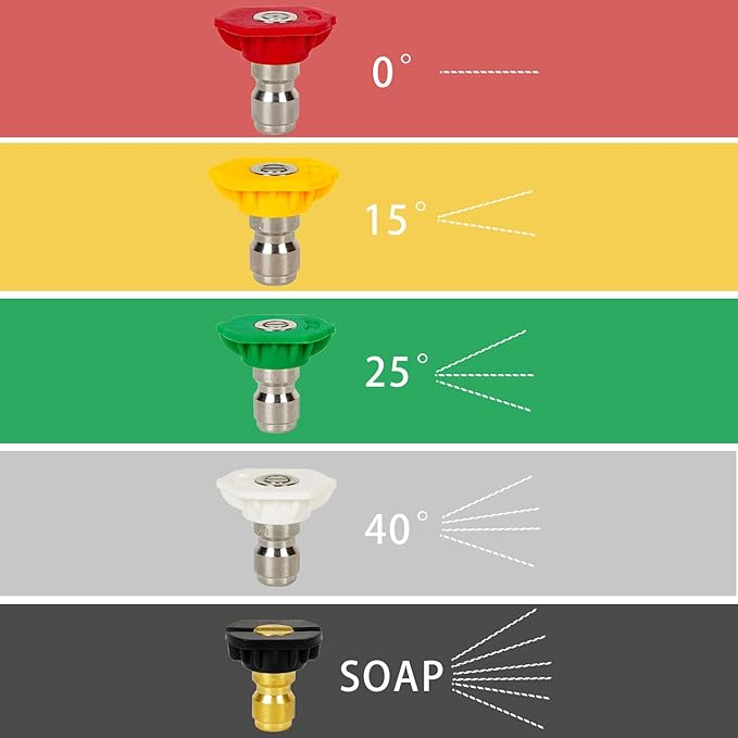 - Versatile Spray Options: This set of pressure washer nozzle tips includes 5 different spray angles—0°, 15°, 25°, 40°, and a 65°soap nozzle—giving you the flexibility to handle a variety of cleaning tasks effortlessly