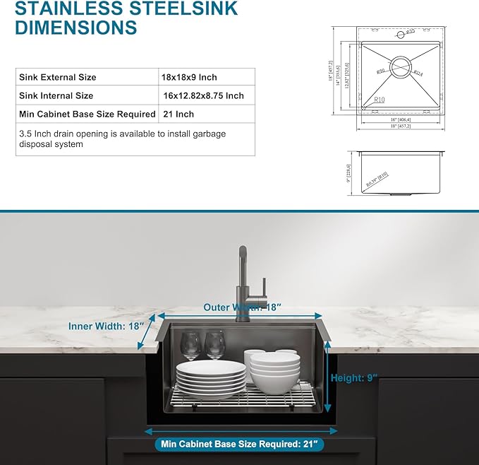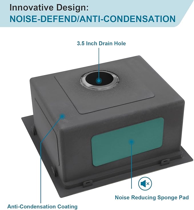 - Noise Reduction and Moisture Control: Our single bowl bar sink comes equipped with a 3mm sound guard undercoating and thick rubber padding to minimize noise and vibration, creating a quieter kitchen environment. The anti-condensation Thickening Noise Reduction Coating effectively absorbs sound and isolates condensation, enhancing overall comfort