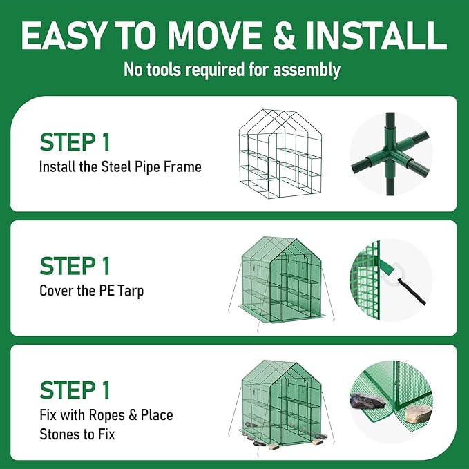 - Upgrade Larger Space: The new upgrade greenhouse measures 56” (L) x 85” (W) x 77” (H) and offers larger internal space that can easily fit up to 36 plant pots at once. Making space for all your blooming flowers, sprouting plants, and fresh vegetables