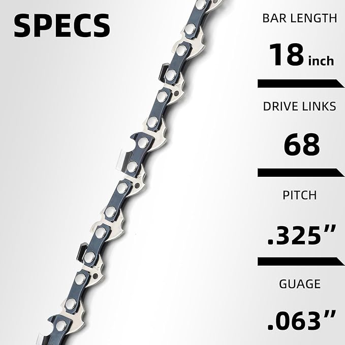 - CHAINS PARAMETERS: 4 packs 18 inch chainsaw chains .325" Pitch, 063" Gauge, 68 Drive Links.
