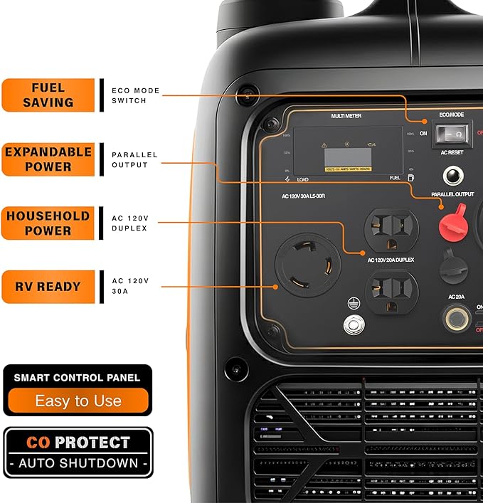 - SAFETY AND COMPLIANCE FEATURES:EPA compliant 3500W generator with CO-MINDER carbon monoxide detection, auto shutoff, parallel ready for double power, 120V outlets and USB ports
