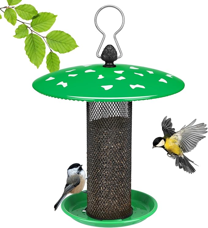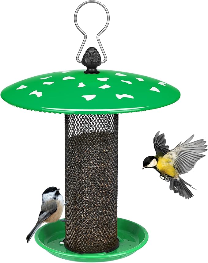 Veehoo Tube Bird Feeders for Outdoors Hanging-Finch Feeder for Nyjer Thistle Seed, Mushroom Metal Mesh Bird Feeder for Outside Hanging, Green