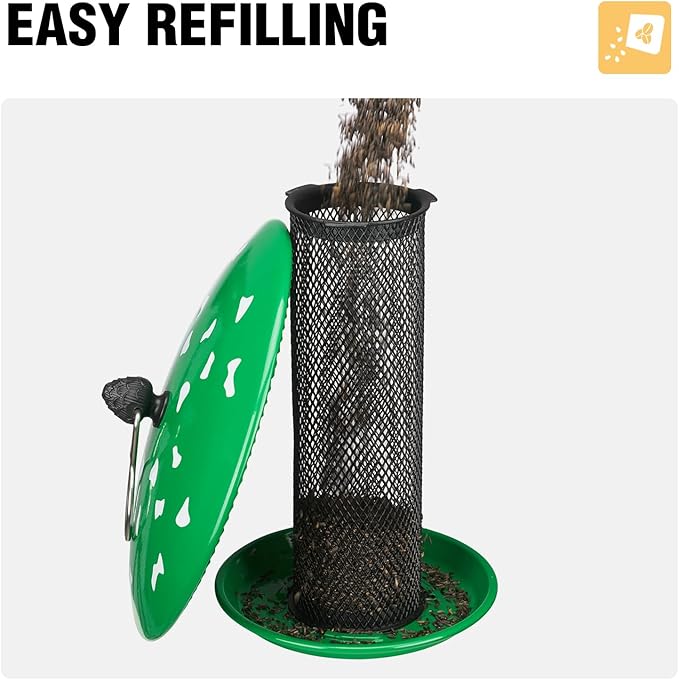 - Weatherproof Design: The mushroom-shaped lid on the bird feeder ensures the seeds stay dry. The bottom seed tray includes drainage holes to prevent water buildup, keeping food fresher for longer. The cute design adds charm to your garden