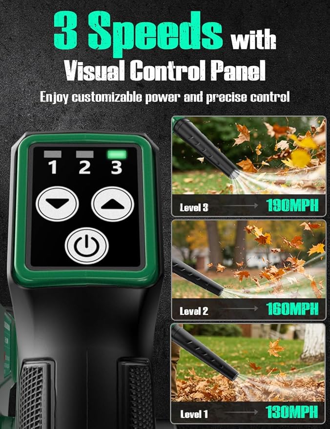 - 🌿【3 Modes & Intuitive Panel Display】This cordless leaf vacuum features an intuitive smart panel display, enabling you to select from 3 speed modes (130 MPH, 160 MPH, and 190 MPH) based on your desired airflow volume. This provides customizable power and precise control for optimal performance. Additionally, the button controls facilitate easy start-up and speed adjustments, eliminating the need to continuously hold down the switch.
