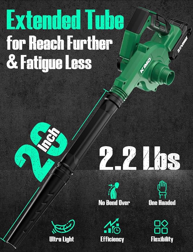- 🌿【No Cords, No Limitation】No working space limitation of corded leaf blower, nor maintenance trouble of gasoline leaf blower. Quick charging device, you can use a fully charged battery leaf blower in just 60 minutes, KIMO battery powered leaf blower will make your cleaning tasks easier and faster, perfect for lawn care, cleaning up the yard or patio, taking care of the garden, light snow removal, computer cleaning, managing leaves, and a variety of outdoor tasks.