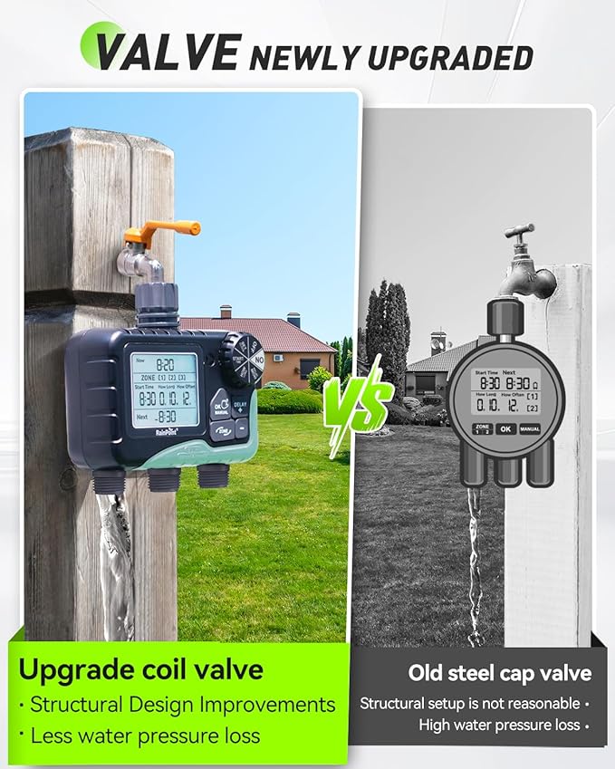- Reinforced and Reliable Connection: The watering timer inlet to body connection is now stronger, with a fortified solenoid valve upgraded to a coil valve, significantly enhancing water flow and reducing bucking.