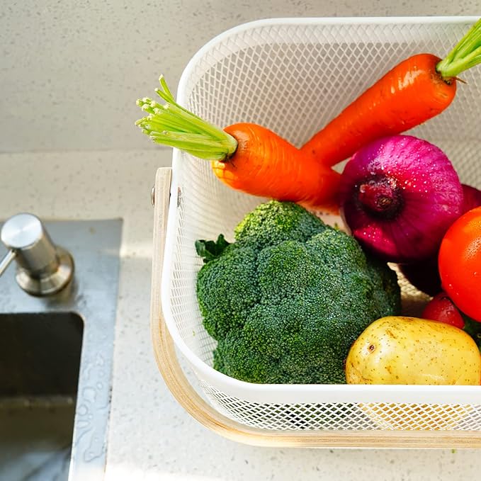 - 🧺Unique Appearance Design: Our mesh basket is a one-piece molding that can not see the seams, which is more beautiful and easy to clean, and will not hide dirt. Just the right mesh design is convenient for you to wash fruits and vegetables in the sink. After cleaning, it is recommended to wipe the metal basket with a dry cloth to extend the service life.