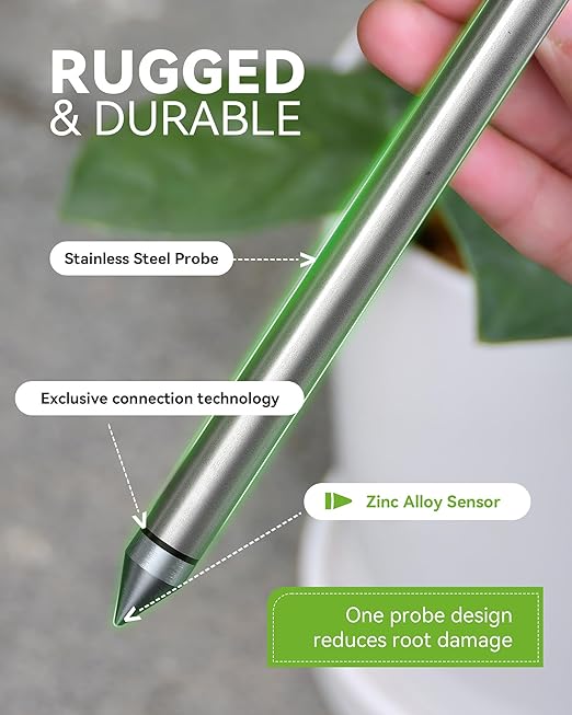 - SAVE YOUR PLANTS: Precision 10mm probe with larger contact surface with soil for more accurate soil moisture measurement. Never overwater or underwater again - keep your plants healthy, lush, and never wilt!