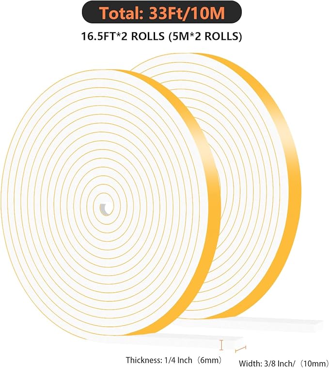 Weather Stripping Door Seal Strip,Weather Strip,Insulation Tape Roll for Insulating Door Frame, Window, Air Conditioner,Self Adhesive Sealing Weatherstrip (White,3/8 in x 1/4 in x 33Ft)