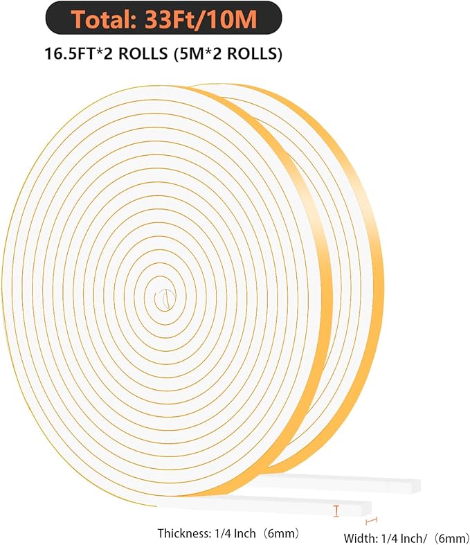 Weather Stripping Door Seal,Door Weather Seal,Soundproof,Cold Insulation,High Density CR Foam Insulation Tape for Front Door Frame, Windows, (White,1/4 in x 1/4 in x 33 Ft)