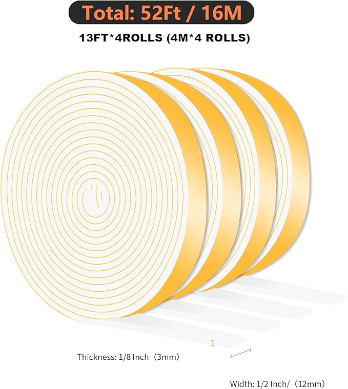 Weather Stripping Door Seal,Door Insulation Strip,Soundproof,Cold Insulation,High Density CR Foam Insulation Tape for Door, Front Door Frame, Windows(White,1/2 in x 1/8 in x 52 Ft)