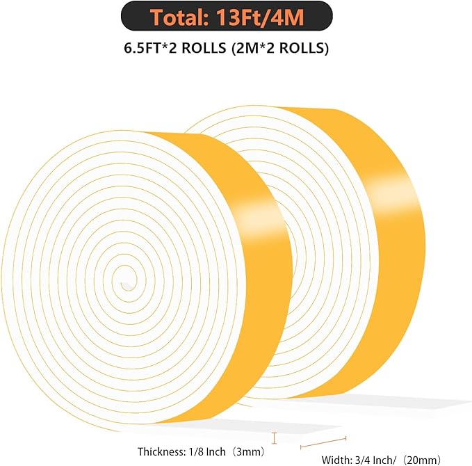 Weather Stripping,Weather Stripping for Door,Strong Adhesive, Lightproof, Soundproof Foam,Door Seal Strip for Door Frame,Window Frame(White,3/4 in x 1/8 in x 13Ft)
