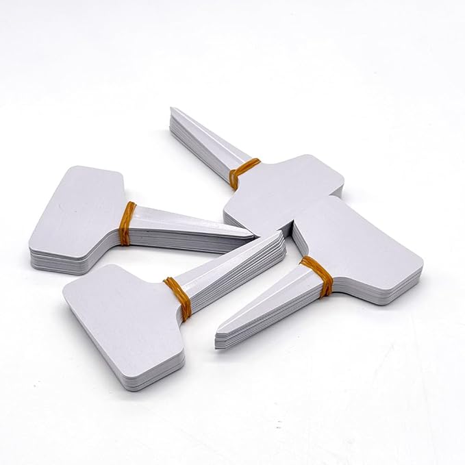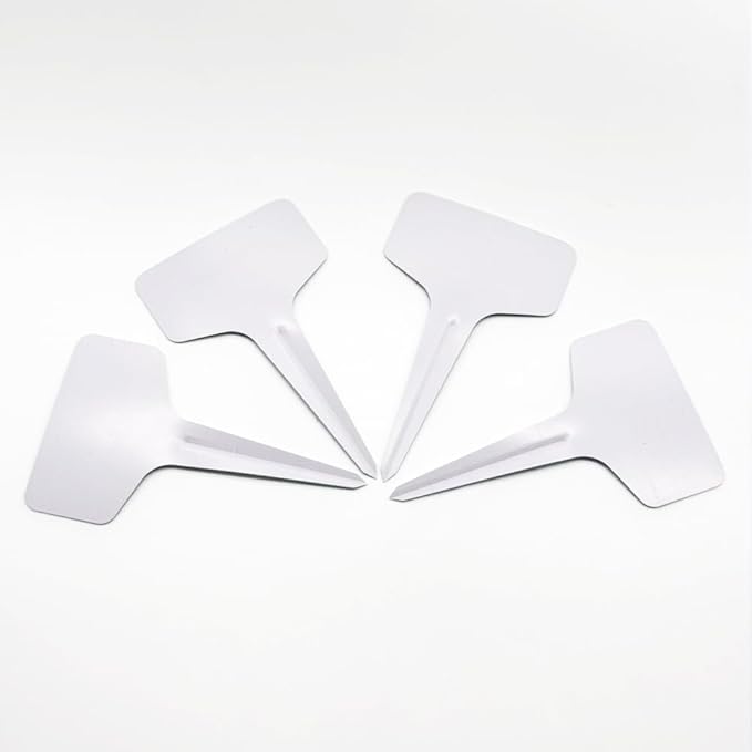 - 100 Pack of T-Type Plant Tags in White. The garden marker is UV resistant and waterproof. Garden Markers can be used in labeling your gardening plant labels markers, wood crates, flower pots, signs, plant pot, garden tools, tool kit, and outdoor greenhouse planters, seed starter tray, nursery pots, plastic tray, gardening gloves, and much more has never been easier! A great addition to your gardening supplies! The plant labels size: 6x10cm (2.4x3.9 inch)