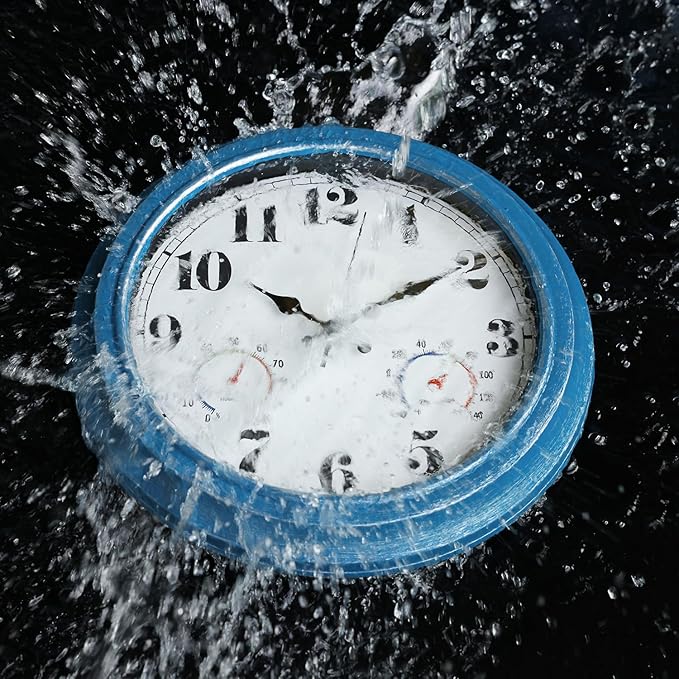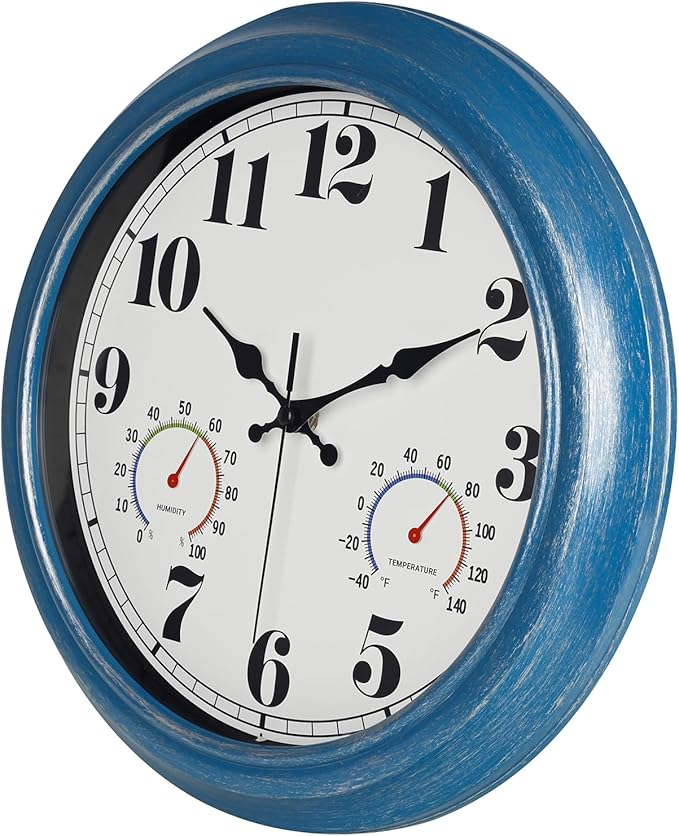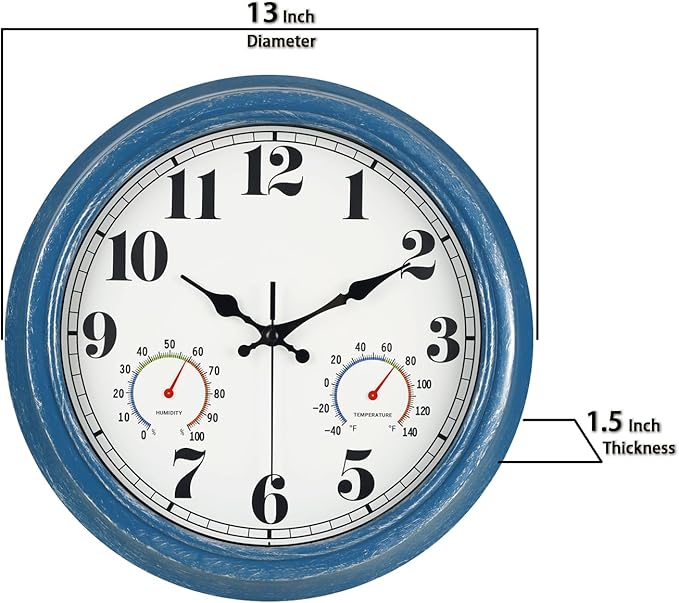 JENLYSTIME 13 Inch Outdoor Clock, Waterproof and Silent, with Thermometer and Hygrometer, Large Numbers for Easy Reading, Perfect for Home,Office,Bedroom,Kitchen,Porch,Garden,Pool(Blue)