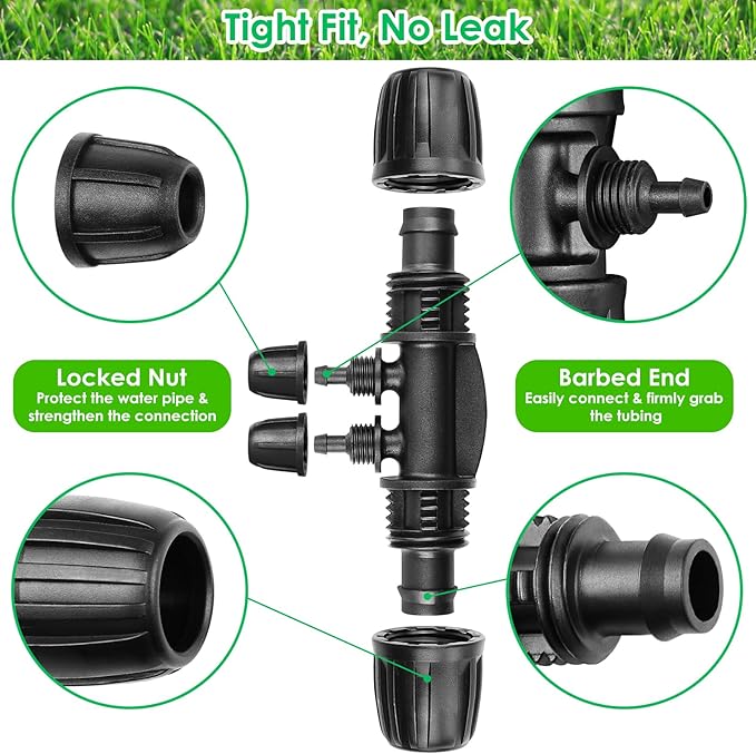 - 【Easy Installation & No Leak】These drip irrigation fittings features the barb design for a secure leak-proof connection, and the twist lock nut adds extra hold and protection to the vinyl tubing. Easy to install without glue, tool or clamp, just push the water pipe firmly onto the barb and tighten the nut.