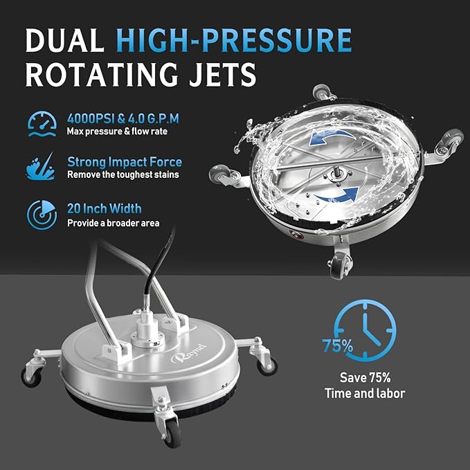 RAYNEL 20'' Pressure Washer Surface Cleaner with 4 Wheels, Dual Handle, Stainless Steel Housing, 2 Hose Adapters, 4 Replacement Nozzles
