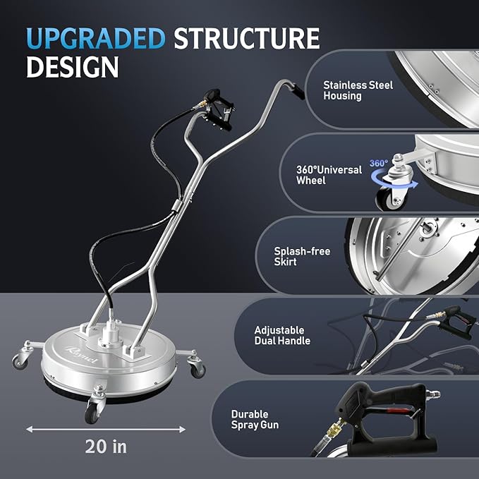- PREMIUM QUALITY - Crafted from durable stainless - steel and featuring a heavy - duty bearing, this surface cleaner is built to last. The splash - free skirt effectively minimizes overspray, ensuring you stay dry during cleaning. An adjustable handle, combined with 4 castors, enables effortless operation and movement, saving you both time and energy.