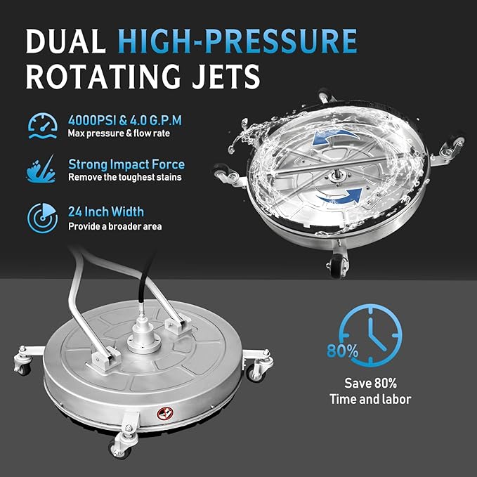 - HIGH EFFICIENCY - Our surface cleaner's dual high - pressure jets spin rapidly, breaking up dirt and grime. Cleaning up to 12 times faster than a single spray nozzle, it significantly cuts cleaning time. By maintaining a fixed nozzle - to - surface height, it also eliminates streaks.