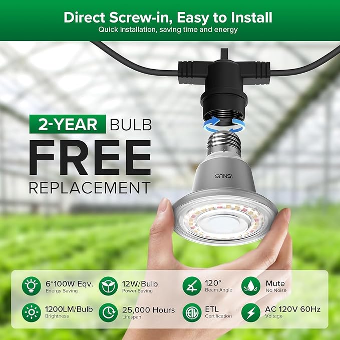 - EASY to INSTALL: The upgraded lens makes the string light effect more effective and allows your plants to grow more vigorously..Sansi waterproof grow lights for indoor plants with hooks, you can fix the grow lights for indoor plants anywhere and adjust the position of the light string worry-free. If there is a problem with one of the light bulbs, the outdoor grow lights waterproof will not affect its use
