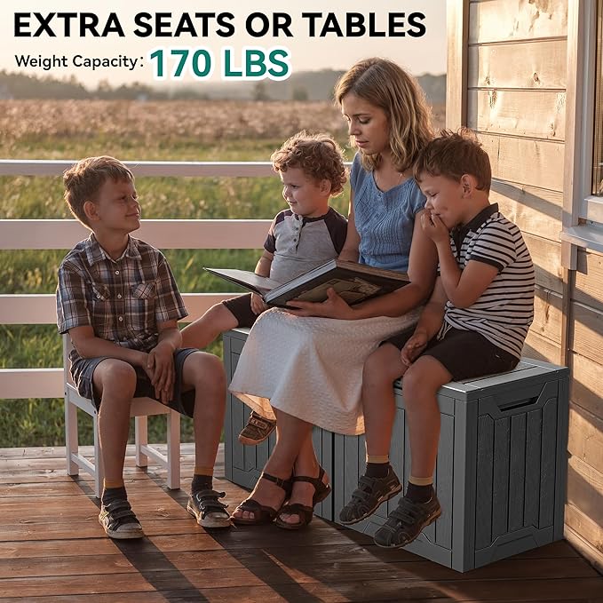 - Versatile Functionality: This outdoor deck box exhibits an attractive wood-like veneer, ideal for storing outdoor necessities and pool equipment with a natural aesthetic; Also converts into a seating storage unit, side table, or al fresco tabletop