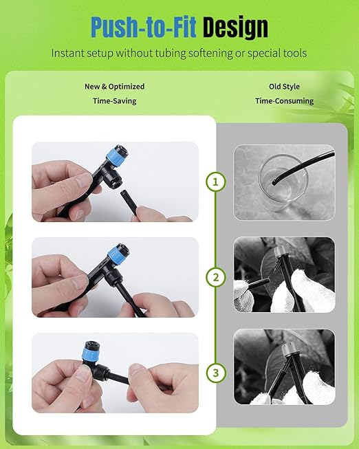 - Push-to-Fit Design: No tubing softening or special tools required! Simply push the tubing into the inlet of the drip irrigation emitter, then insert it into the soil. To detach it, just press the inlet and pull out the tubing. (NOTE: Tubing Not Included!)