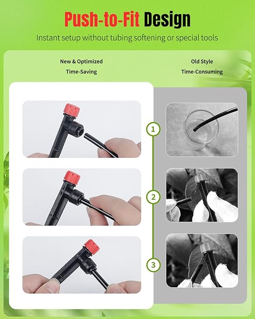 - Push-to-Fit Design: No tubing softening or special tools required! Simply push the tubing into the inlet of the drip irrigation emitter, then insert it into the soil. To detach it, just press the inlet and pull out the tubing. (NOTE: Tubing Not Included!)