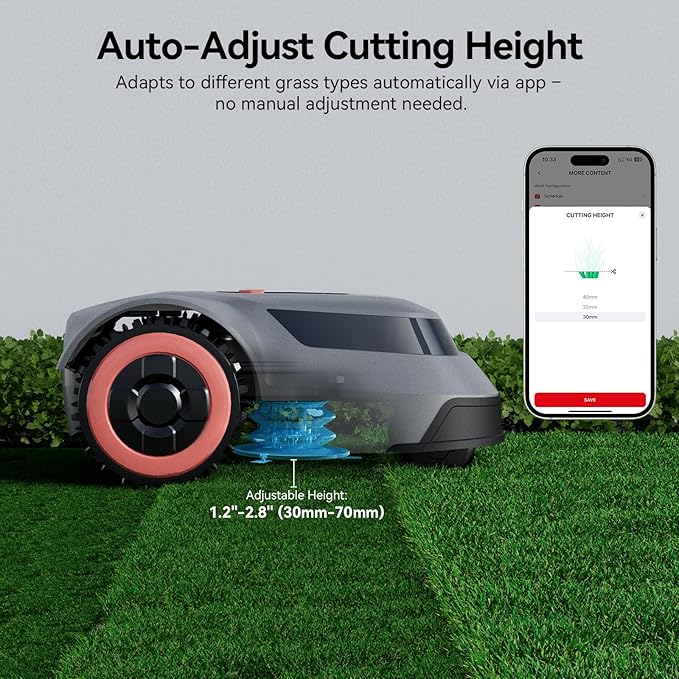 - Intelligent Blades: You can adjust the cutting height of the robotic lawn mower via the app, which increases the mowing area more. When blocked by tall or dense grass, the intelligent blade automatically adjusts to keep the lawn mowing work prioritized and successfully completed.