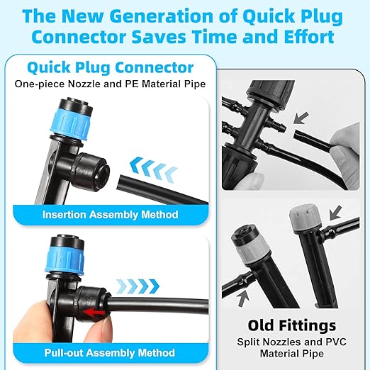 - QUALITY MATERIAL: The old barbed type drip irrigation system is made of PVC water pipe, so it will be knotted or deformed, thus affecting the effect of water spraying, used as outdoor garden drip irrigation system only about half a year's time will be aging and cracking, thus causing water leakage. And our new quick-plug type garden drip irrigation system is made of PE water pipe, to avoid the shortcomings and shortcomings of PVC water pipe, it will not be deformed more will not aging and cracking, in the watering of plants to avoid leakage, its service life of up to 10 years.