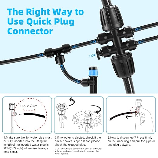 - EASY AND QUICK TO ASSEMBLE: Quick connect fittings are great and prevent leaks. SUPER EASY TO ASSEMBLE. The system is great, easy to build and easy to assemble. Different sizes of drip irrigation kit attachments are much better than the standard attachment system.
