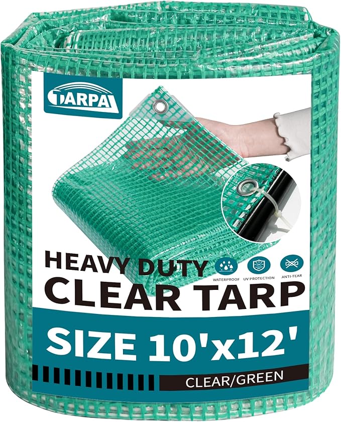 - 【12mil Heavy Duty Clear Green Tarp】 Our clear green tarp is made of high quality polyethylene material. Clear tarp Waterproof is soft, easy to fold, not easy to deformation, reusable, Tarp cold, snow, water, dust, UV protection.
