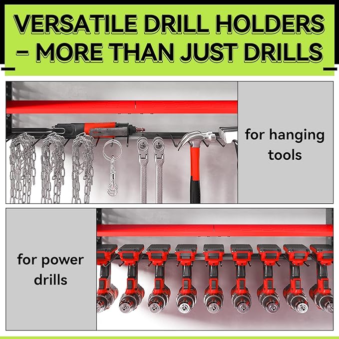 - Bottom Shelf for 9 Tools: The spacious bottom tool shelf wall storage accommodates up to 9 hand or power tools, providing ample storage for your essential equipment. Featuring J-shaped hooks, this design ensures tools are securely hung and prevents tipping and easy to access. Doubles as a handy hanger for small tools - smarter than traditional cordless tool organizer!