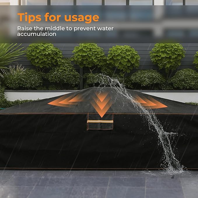 - 【Secure All-Weather Fastening】 Dual adjustable side buckles and 4 heavy-duty anchor straps keep the outdoor furniture cover firmly secured. Two fluorescent handles simplify removal and storage, while a reinforced elastic hem with clamp locks minimizes wind lift. Use included support rods to prevent water pooling.