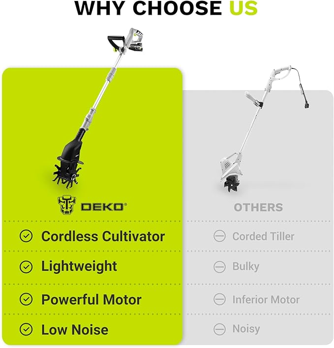 - Cordless Freedom: Say goodbye to tangled cords & gas—the DEKO electric garden tiller delivers true cordless convenience with its 20V 2000mAh Li-ion battery, offering 40 minutes of no load run time! Weighing just 2.7kg, this electric cultivator glides through tight spaces, flower beds, or raised gardens without breaking a sweat. No oil, no noise—just pure, eco-friendly tilling power!