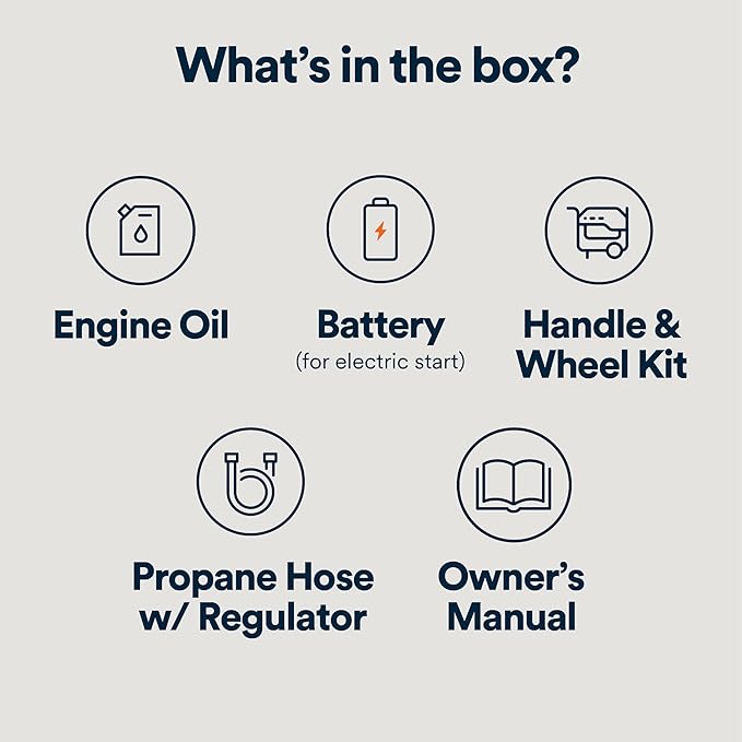 - Included Components : Engine Oil, LP Hose, battery, handle & wheel kit, owner's manual