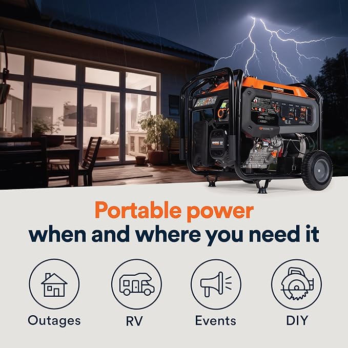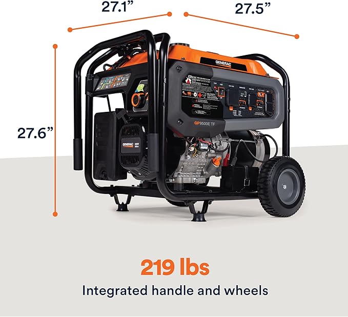 - Durable Protection: The Generac GP9500 features covered outlets for added protection against harsh environments and rugged conditions, ensuring powerful performance for emergency backup and recreational use