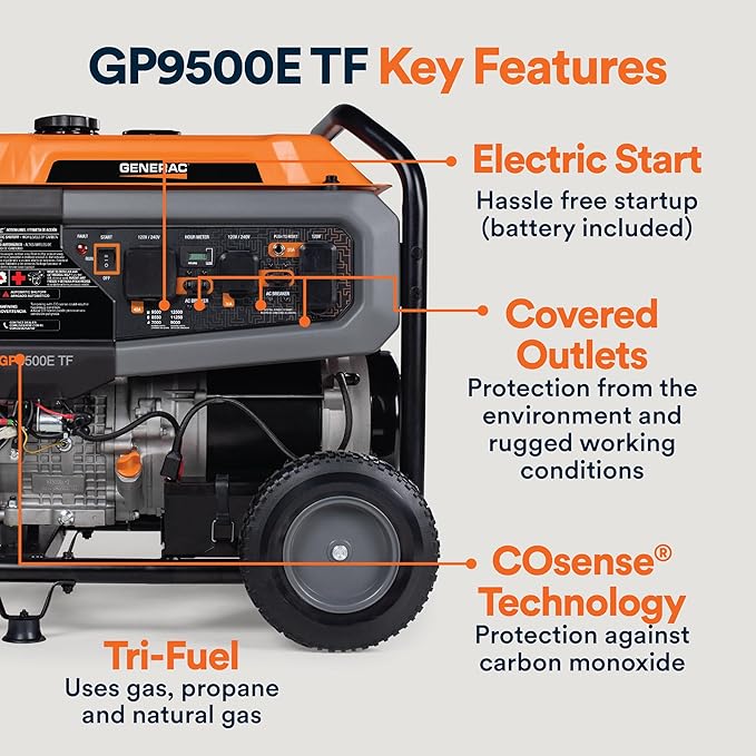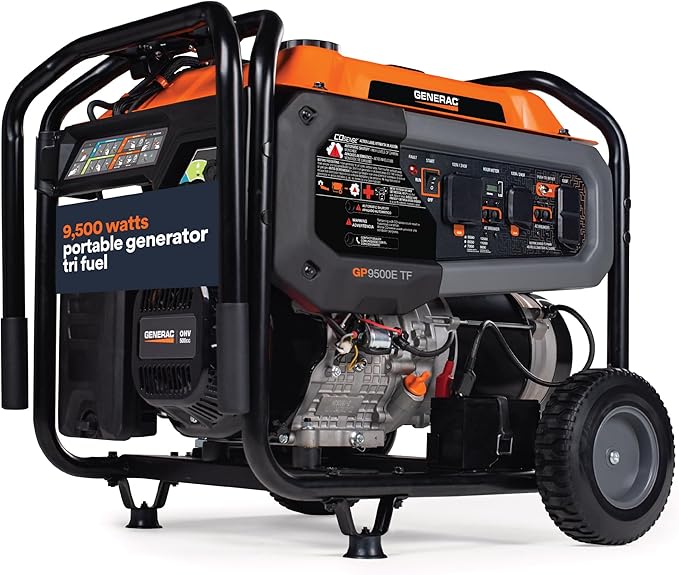 Generac 12,500/9,500-Watt Tri-Fuel Portable Generator - Electric Start - Gas, Propane or Natural Gas - Home Backup, Jobsite, or RV - Quiet Operation - Long Runtime - 50-State Compliant