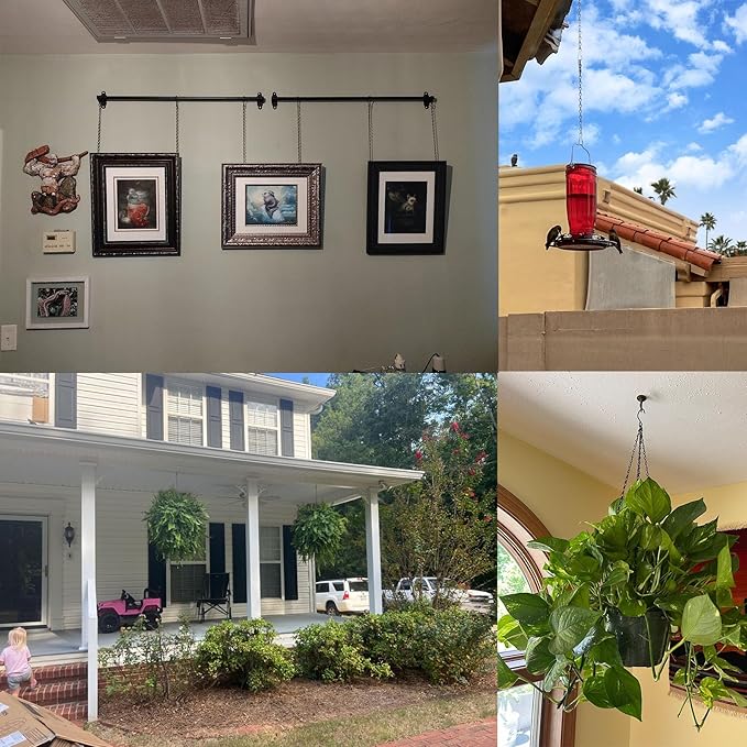 - Superior Weather Resistance Hanging Plant Extender:With antirust coating design, the celling hook with chains are made of iron, and thickening them enough to hanging flower pots, bird houses and more. You don't worry cause the hanging pot bird feeder to fall off the branch. It withstand harsh weather conditions, resist frost, cracking and spalling damage.It can be used indoors or outdoors.Easy to use.